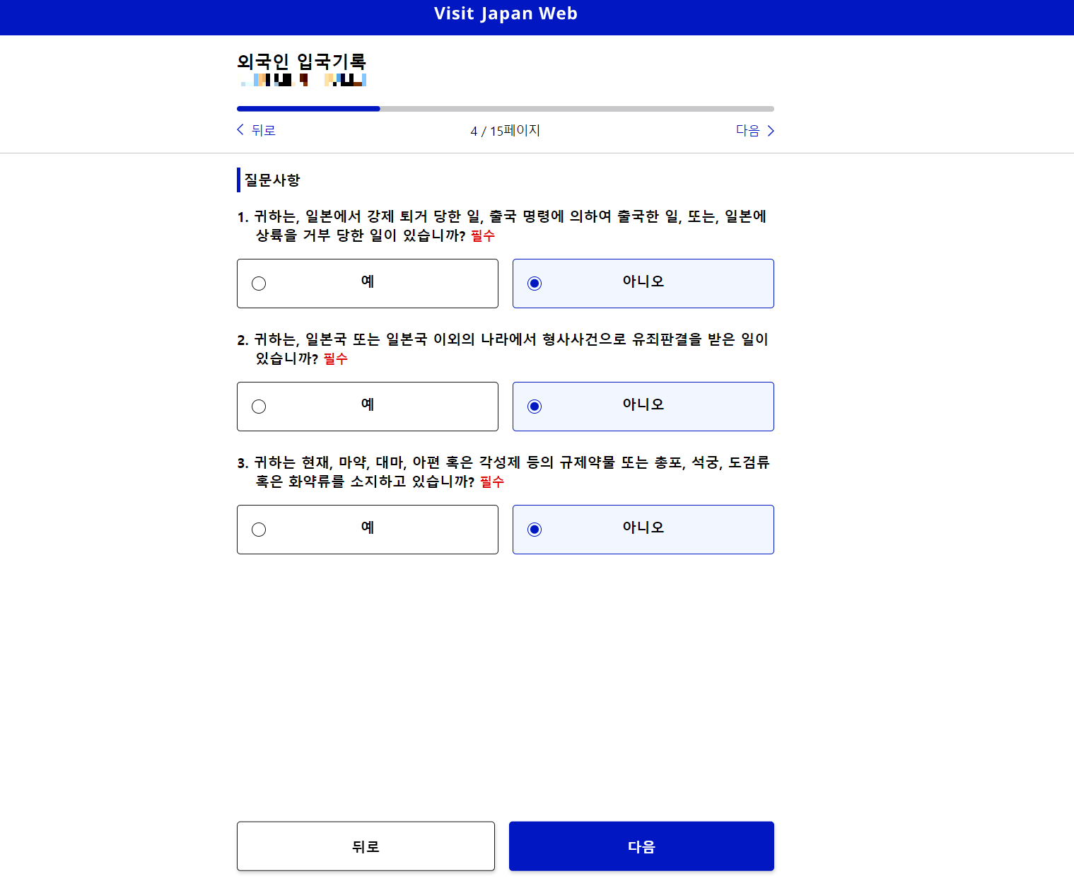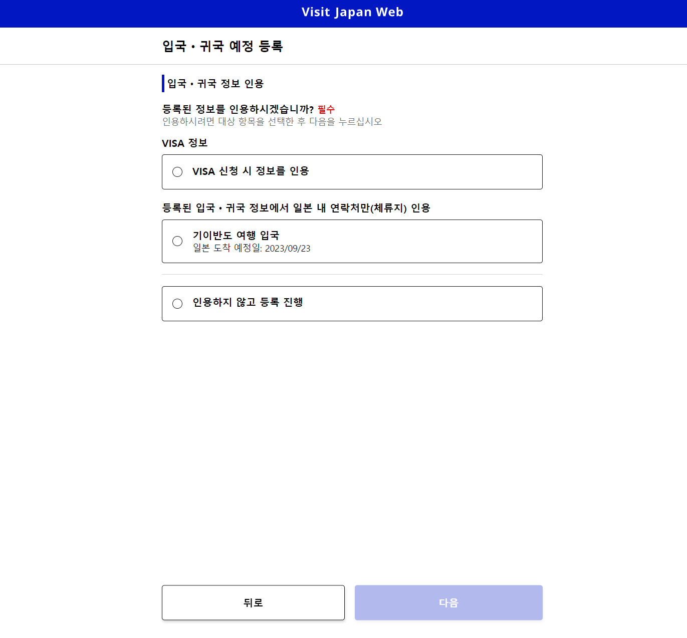 이제 마지막 단계이자 본래 목표였던 입국 수속을 미리 밟는 단계인 Step 4 입국/귀국 수속 입력 단계입니다.