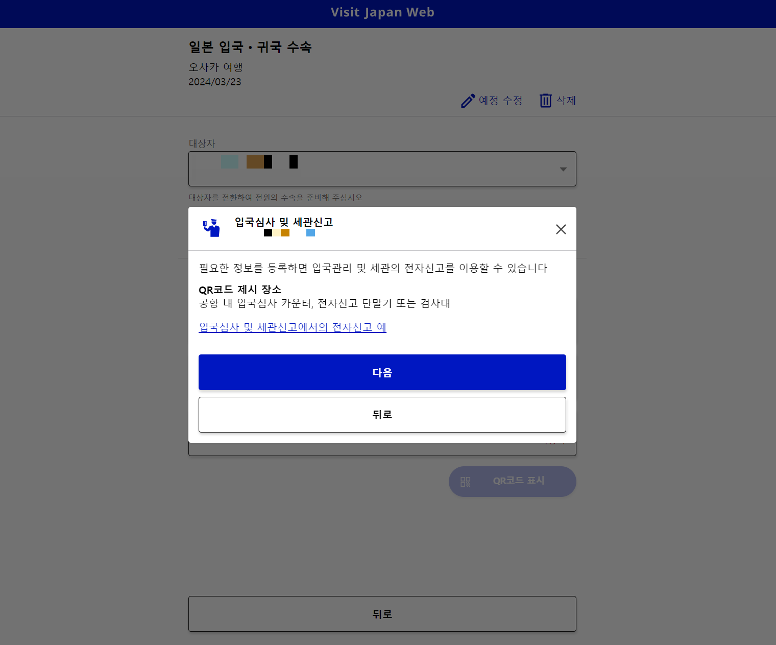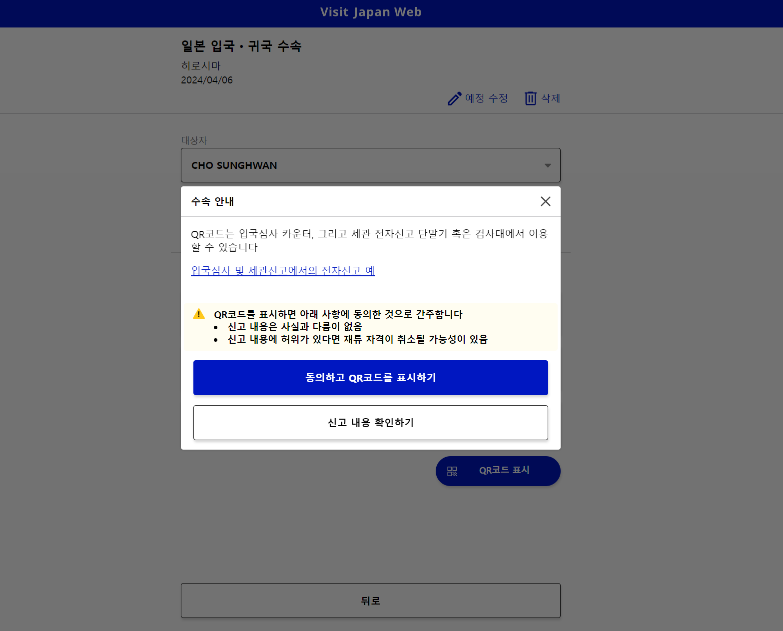 아까는 미등록상태였던 입국심사 및 세관신고가 등록으로 바뀌었고, 밑의 QR코드 표시도 활성화가 되었네요. QR코드를 클릭합니다.