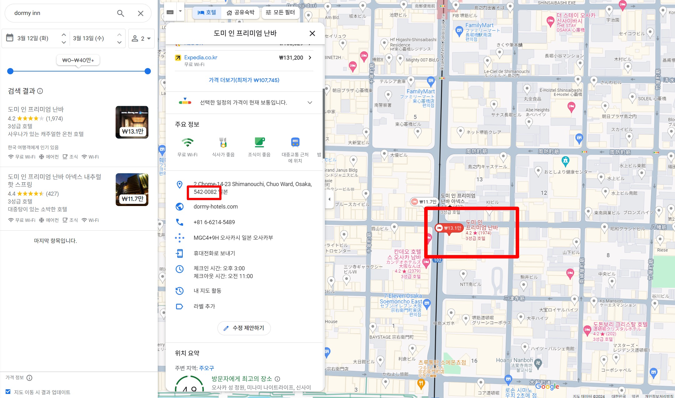 구글지도에서 일본 입국 후, 첫날 머무르는 숙소를 검색합니다. 필자는 도미인으로 예시를 들겠습니다.