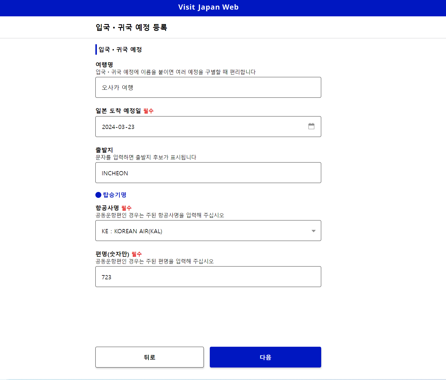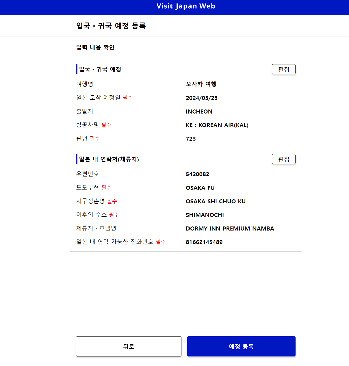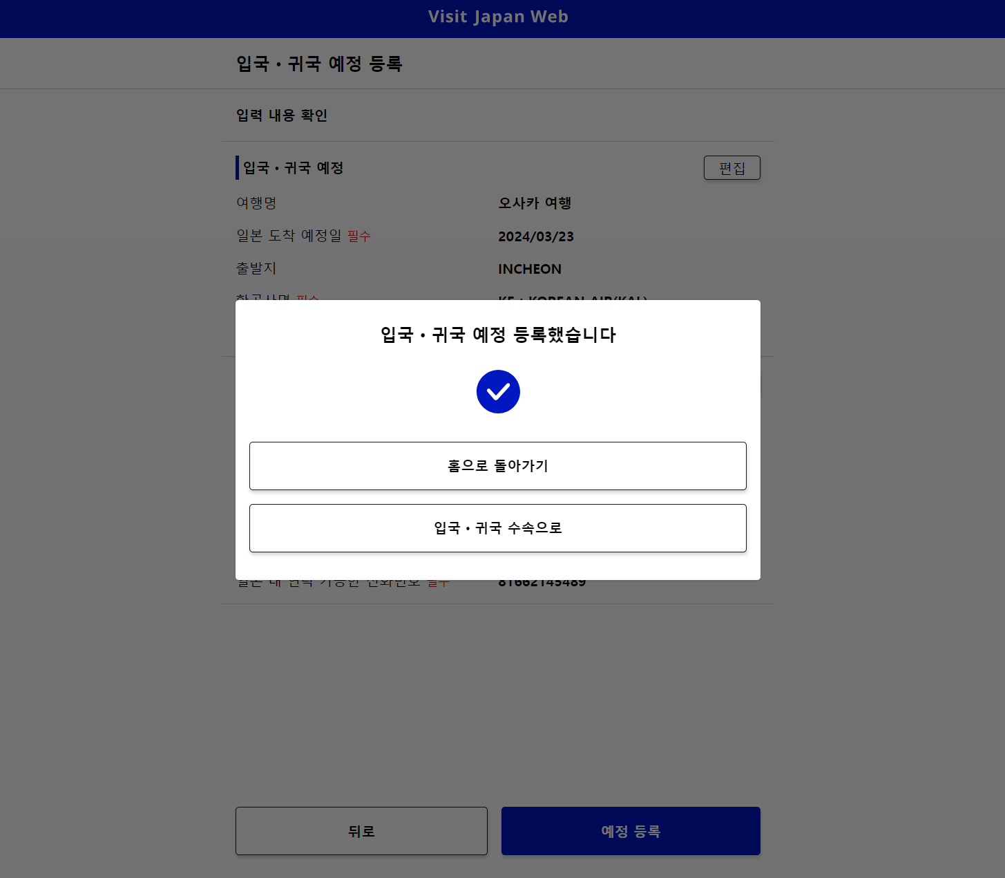 이렇게 해서 Step 2 는 입국/귀국 일정 등록 단계가 완료되었습니다!