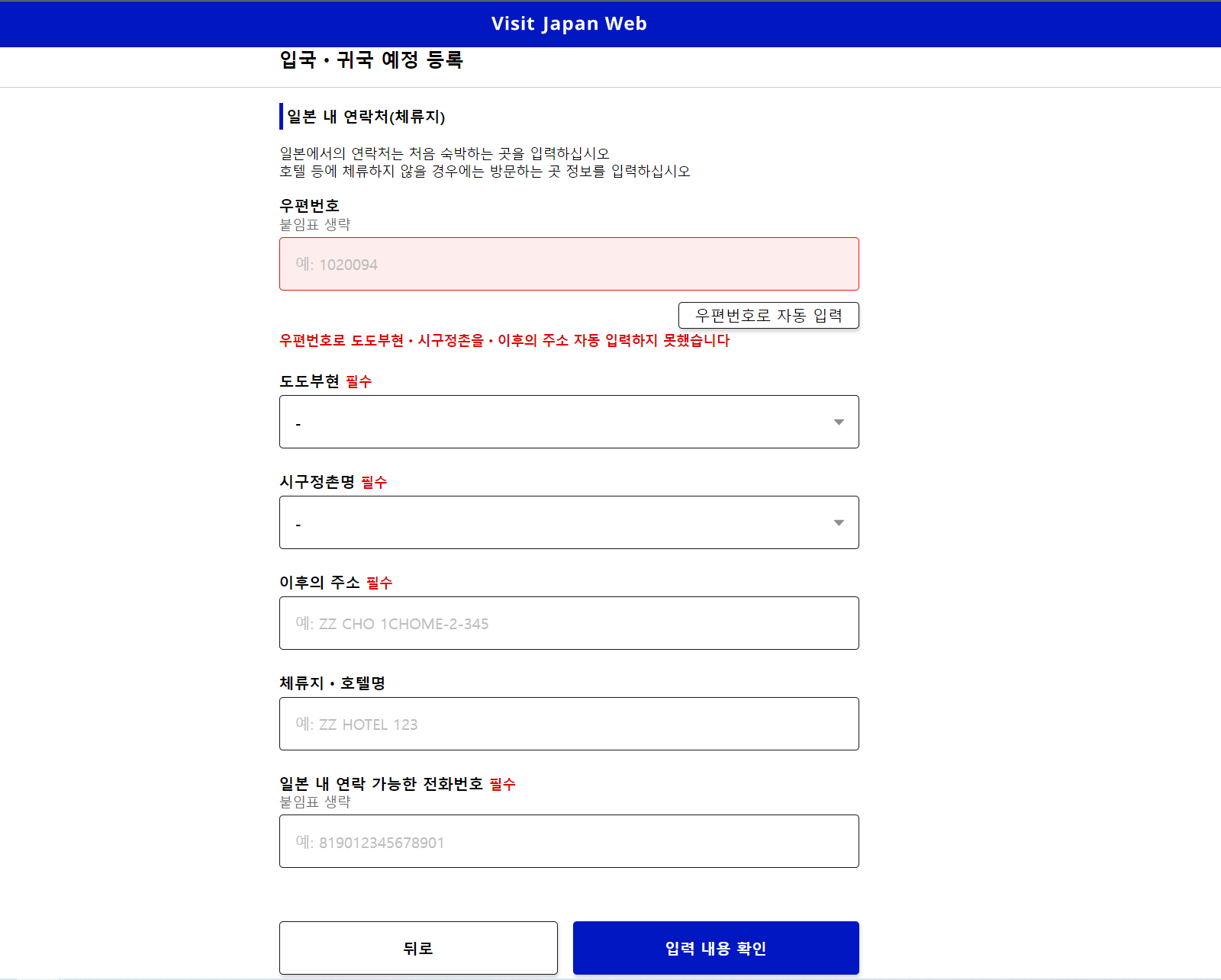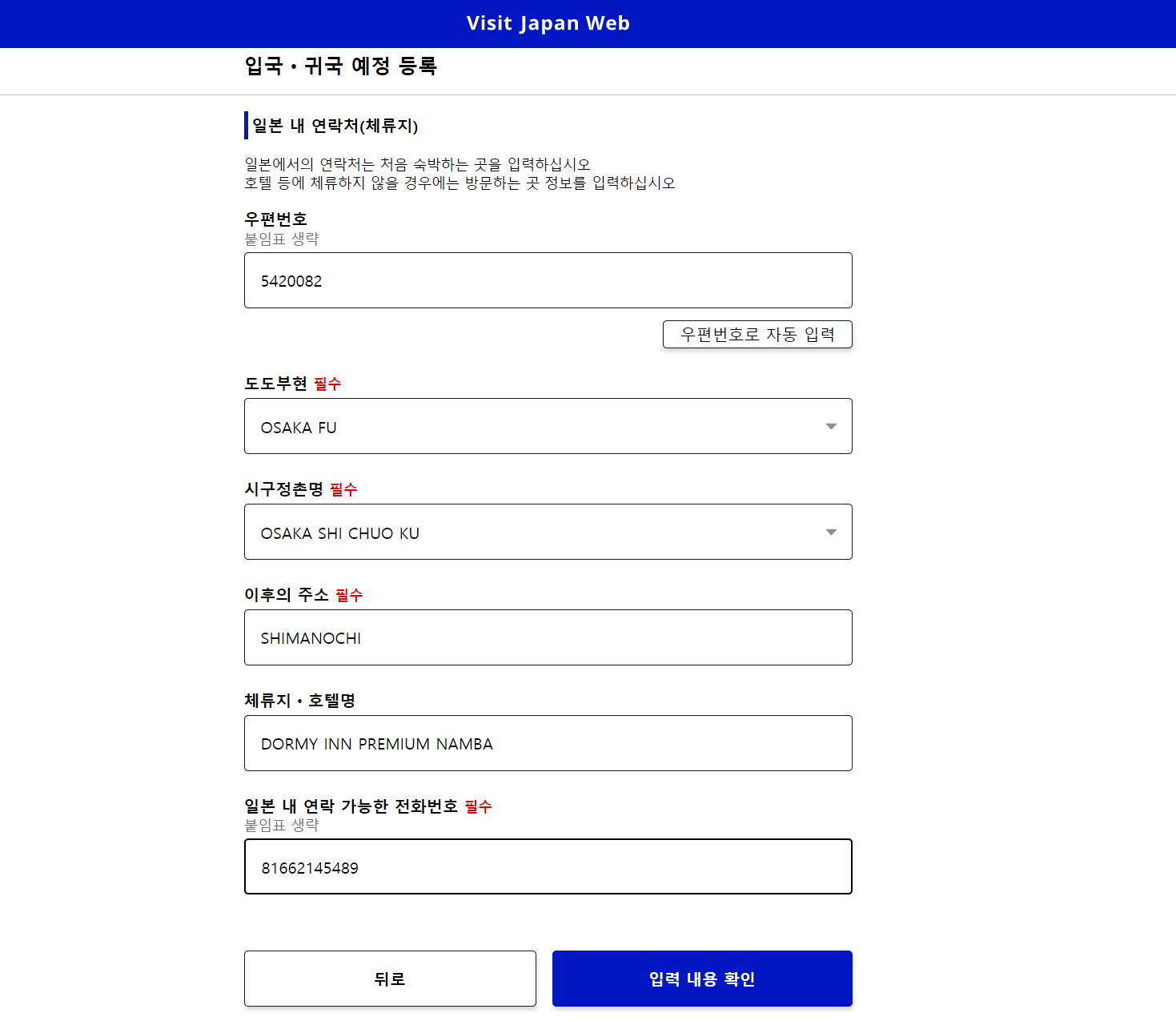그 후, 체류지/호텔명 과 일본 내 연락가능한 전화번호는 자신이 예약한 호텔명과 호텔 연락처를 입력하면 됩니다.