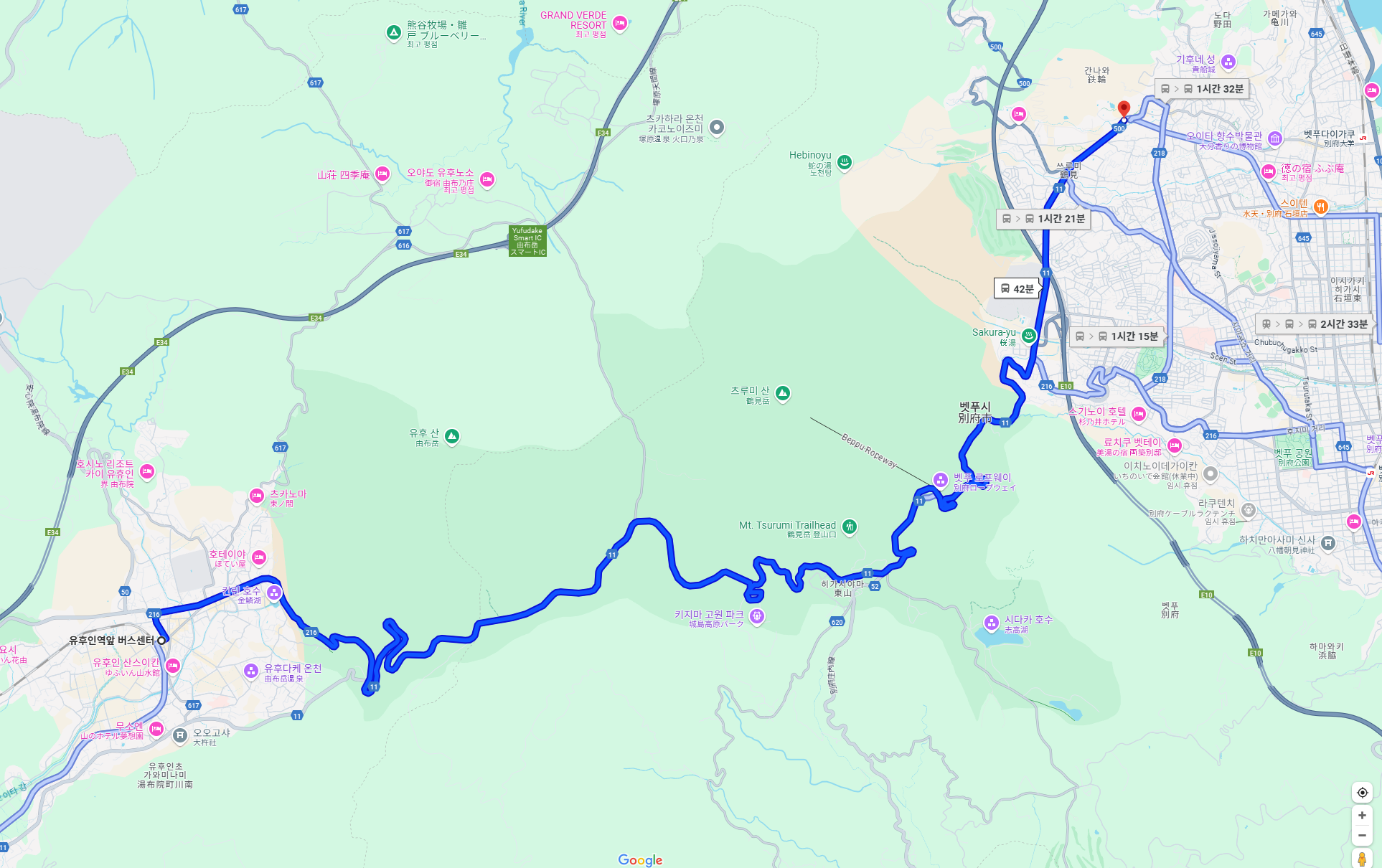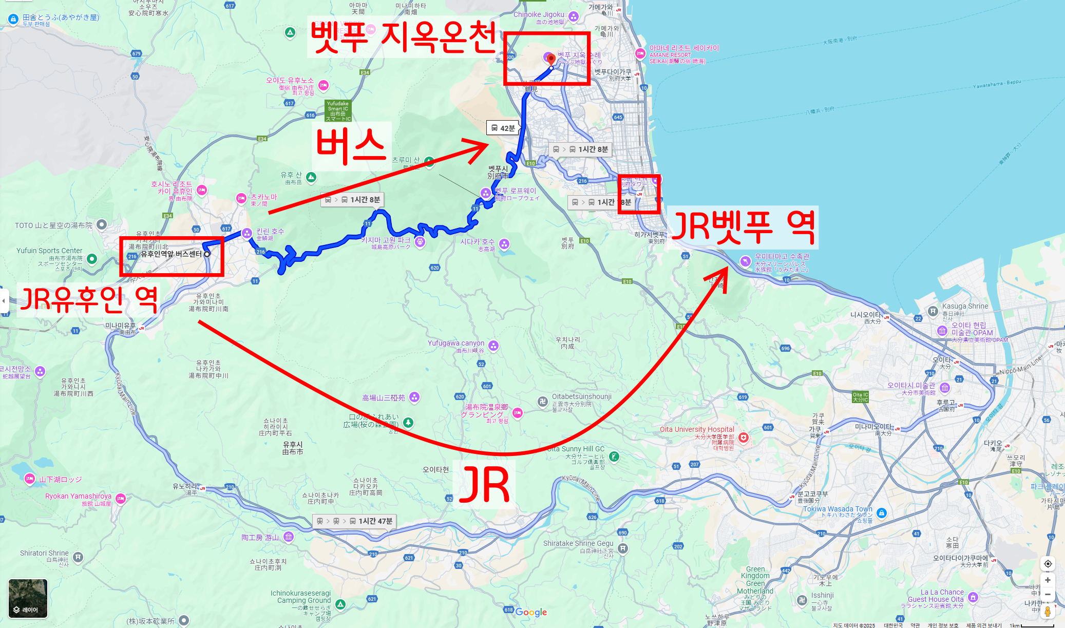 먼저 간단하게 지도를 보도록 하겠습니다. 유후인과 벳푸 사이에는 산이 하나 있는데, 버스는 이 산을 가로지르고, JR은 이를 우회하여 JR오이타 역 쪽으로 가게 됩니다.